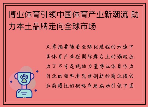 文章摘要:随着全球化进程的加速,中国体育产业在国际舞台上的崛起成为了不可忽视的力量。博业体育作为行业的领军者,凭借创新的商业模式和前瞻性的战略布局,成功引领中国体育产业的新潮流,助力本土品牌走向全球市场。通过深入分析博业体育在产业发展、市场拓展、品牌建设以及数字化转型等多个方面的卓越表现,可以发现其不仅为中国体育产业注入了新鲜活力,也为全球体育市场带来了新的机遇。本文将从四个方面详细探讨博业体育如何推动中国体育产业的发展,并探索其背后成功的关键因素。