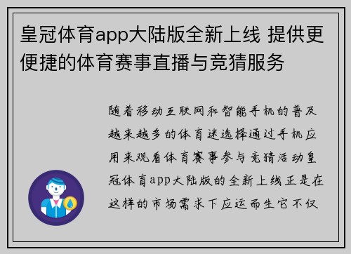 随着移动互联网和智能手机的普及,越来越多的体育迷选择通过手机应用来观看体育赛事、参与竞猜活动。皇冠体育app大陆版的全新上线,正是在这样的市场需求下应运而生。它不仅为用户提供了便捷的体育赛事直播功能,还创新性地结合了实时竞猜服务,进一步提升了用户的参与感和娱乐性。本文将从四个方面详细探讨皇冠体育app大陆版全新上线所带来的体育赛事直播和竞猜服务的便捷性。首先,我们将分析其直播功能的优化,接着讨论实时赛事数据的提供,再者介绍其全面的竞猜功能,最后分析平台在用户体验上的提升。通过这四个方面的分析,本文旨在全面展示皇冠体育app大陆版如何为用户带来更高效、更愉悦的体育娱乐体验。